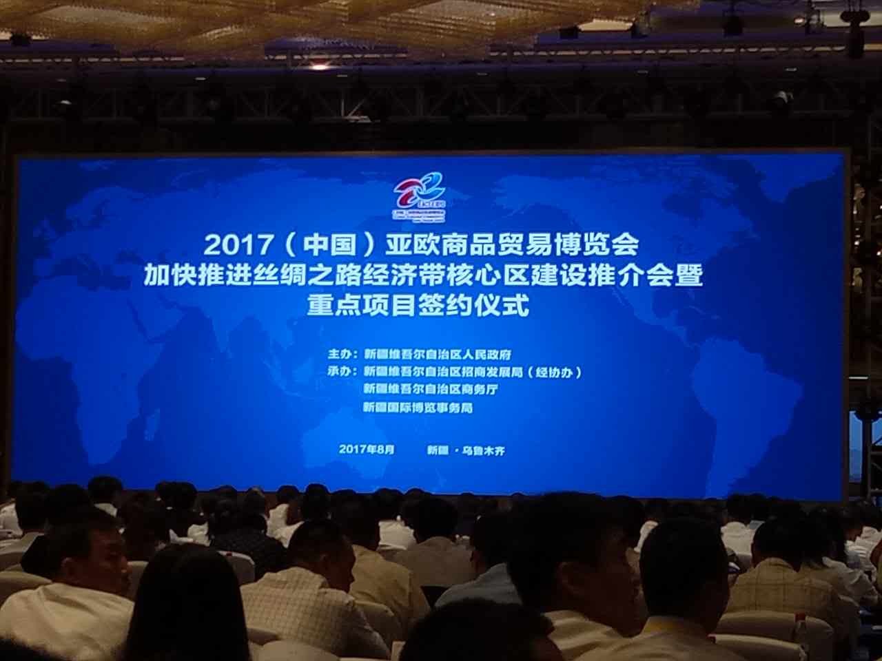 2017年 8月26日(星期六)上午10:30,“2017(中国)亚欧商品贸易博览会加快推进丝绸之路经济带核心区建设推介会暨重点项目签约仪式”在乌鲁木齐希尔顿酒店疆山B+C厅隆重举行。会议由新疆维吾尔自治区人民政府主办,自治区招商发展局(经协办)、商务厅、新疆国际博览事务局承办。