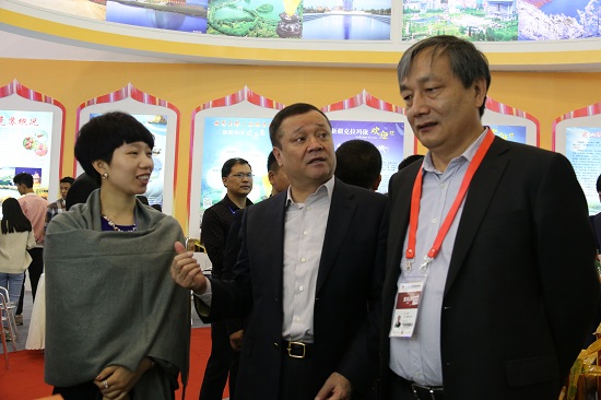 自治区人民政府副秘书长杨伊波(右一)在自治区招商发展局局长尼加提•司马义的陪同下巡视第十六届西博会新疆展馆