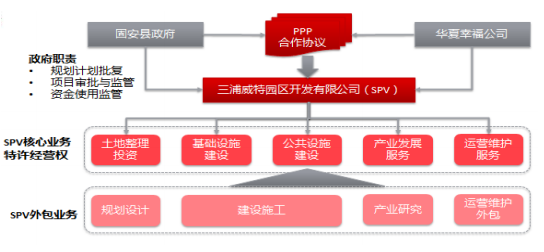 固安县政府与华夏幸福公司签订排他性的特许经营协议,设立三浦威特园区建设发展有限公司(简称三浦威特)作为双方合作的项目公司(SPV),华夏幸福公司向项目公司投入注册资本金与项目开发资金。项目公司作为投资及开发主体,负责固安工业园区的设计、投资、建设、运营、维护一体化市场运作,着力打造区域品牌;固安工业园区管委会履行政府职能,负责决策重大事项、制定规范标准、提供政策支持,以及基础设施及公共服务价格和质量的监管等,以保证公共利益最大化。